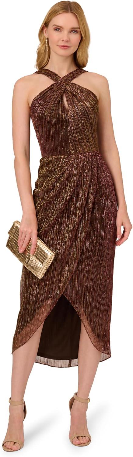 Adrianna Papell Womens Halter Crinkle Metallic Dress(Copper)
