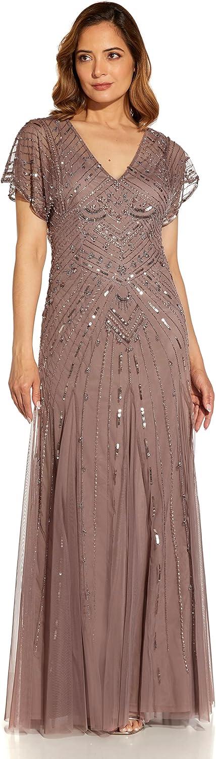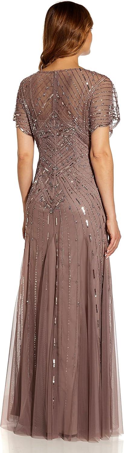 Adrianna Papell Women’s Beaded Flutter Sleeve Gown(Stone)
