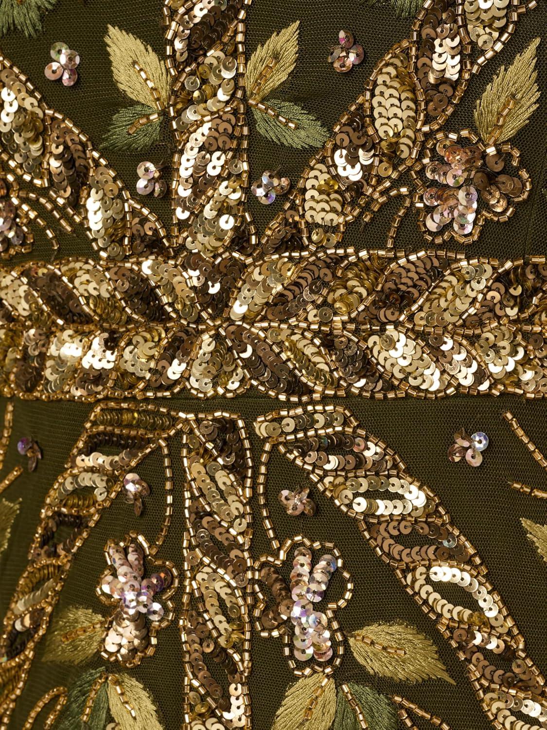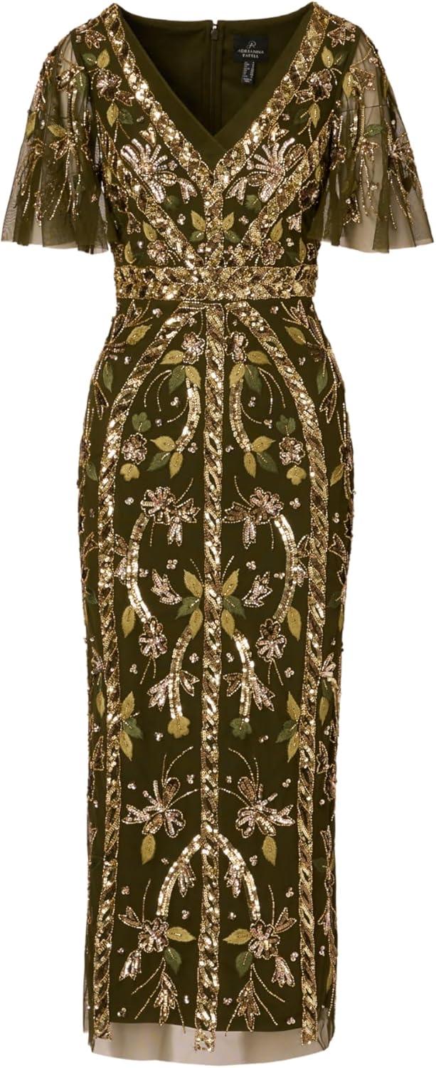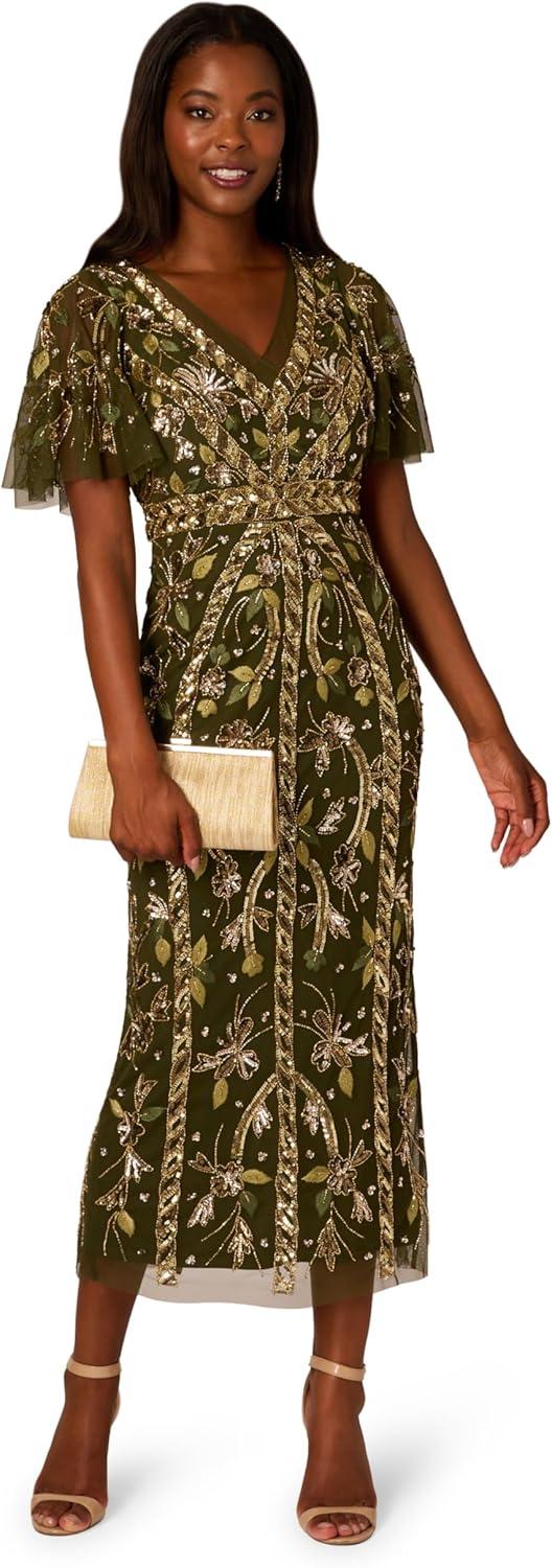 Adrianna Papell Women’s Beaded Flutter Sleeve Dress(Olive)