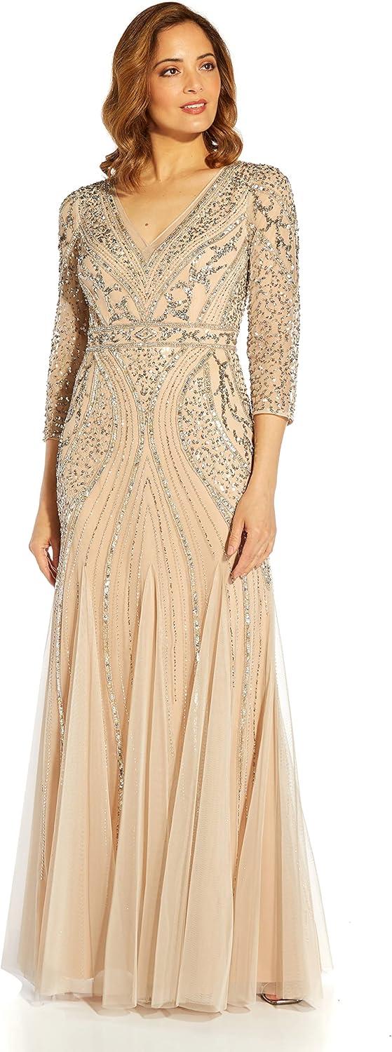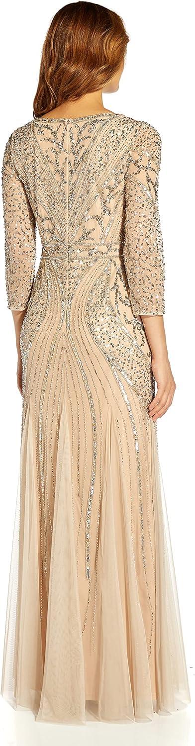 Adrianna Papell Women’s Beaded Mesh Godet Gown(Silver/Nude)