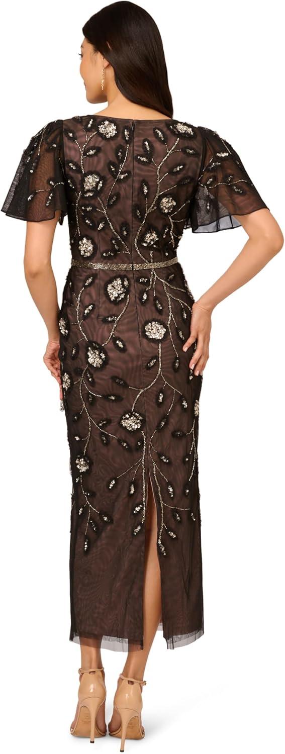 Adrianna Papell Women’s Beaded Mesh Column Dress(Black/Rosegold)