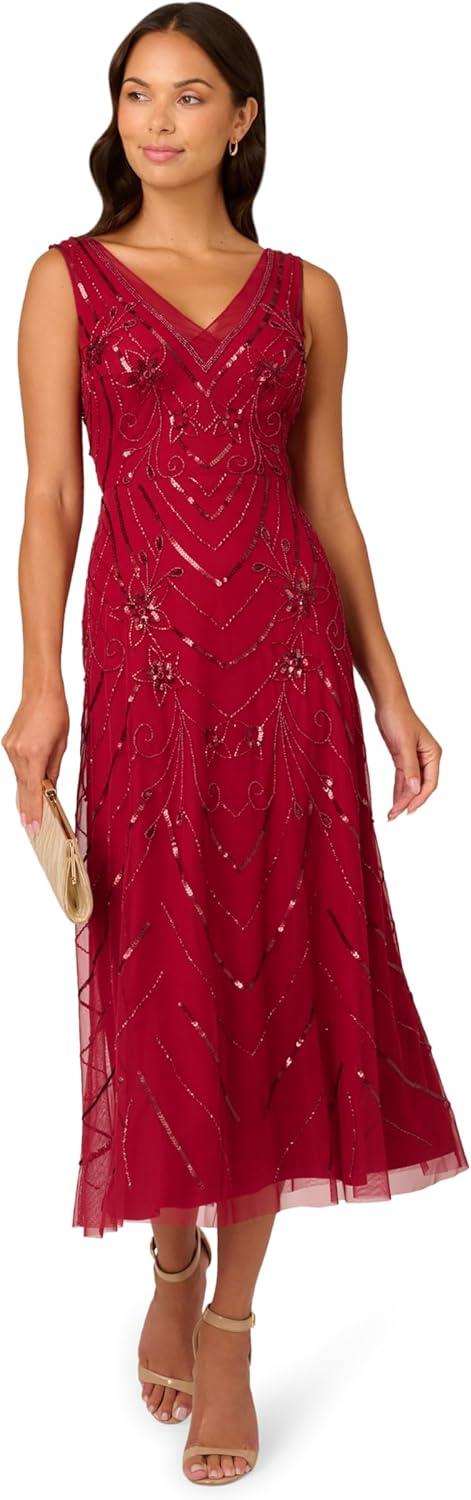Adrianna Papell Women’s Beaded Mesh Dress(Cranberry)
