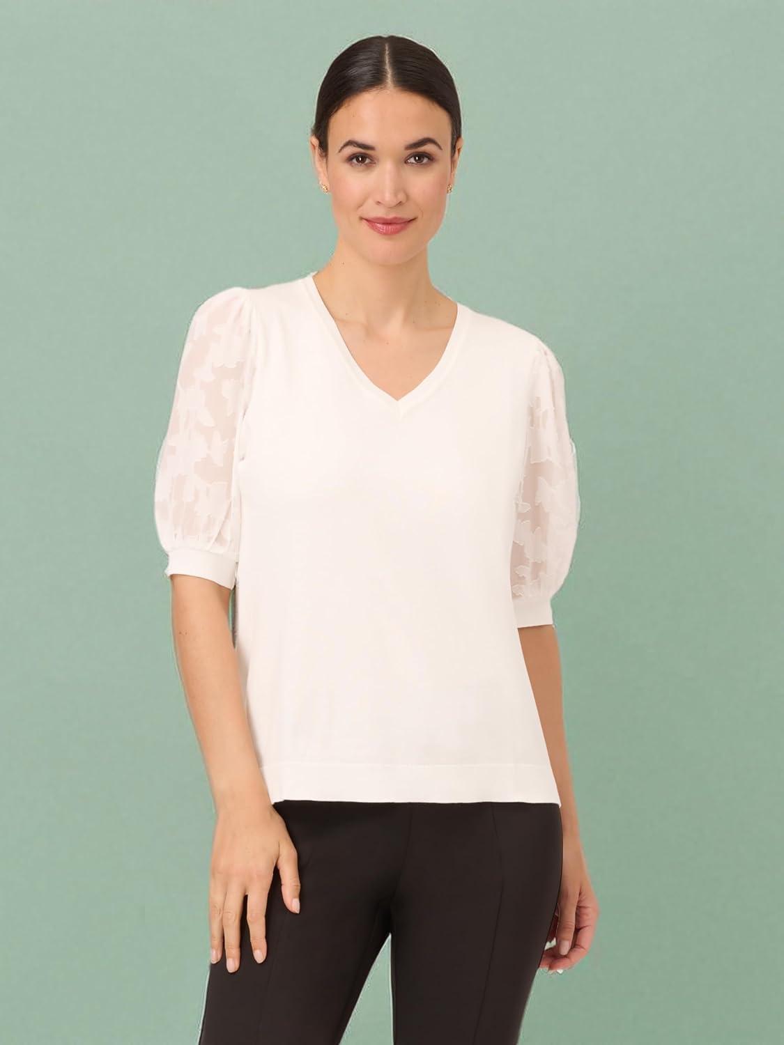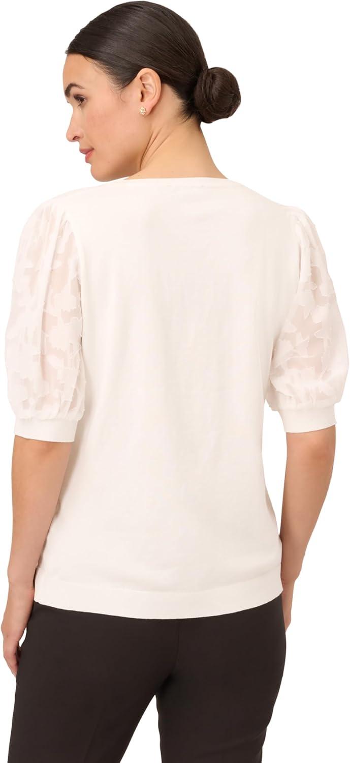 Adrianna Papell Women’s 3/4 Floral Burnout Sleeve V-Neck Sweater(Ivory)