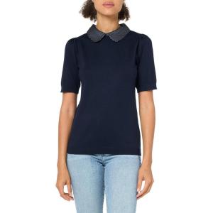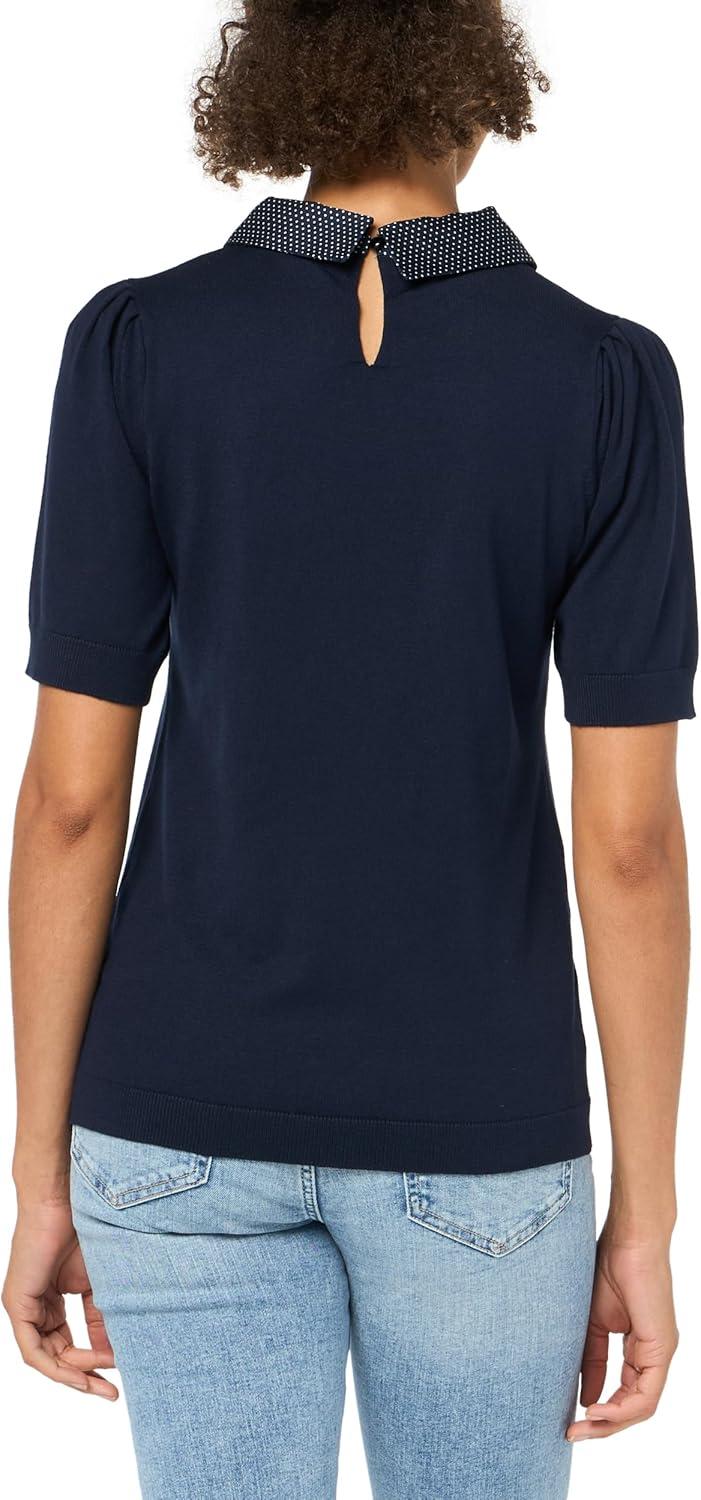 Adrianna Papell Women’s Pointelle Short Sleeve Polo Striped V-Placket Sweater(Ivory/Navy)