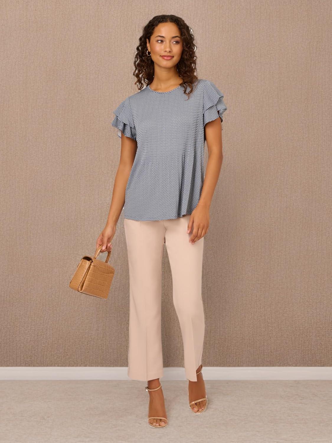 Adrianna Papell Women’s Solid Short Ruffle Sleeve Popover Blouse(Blue Moon)