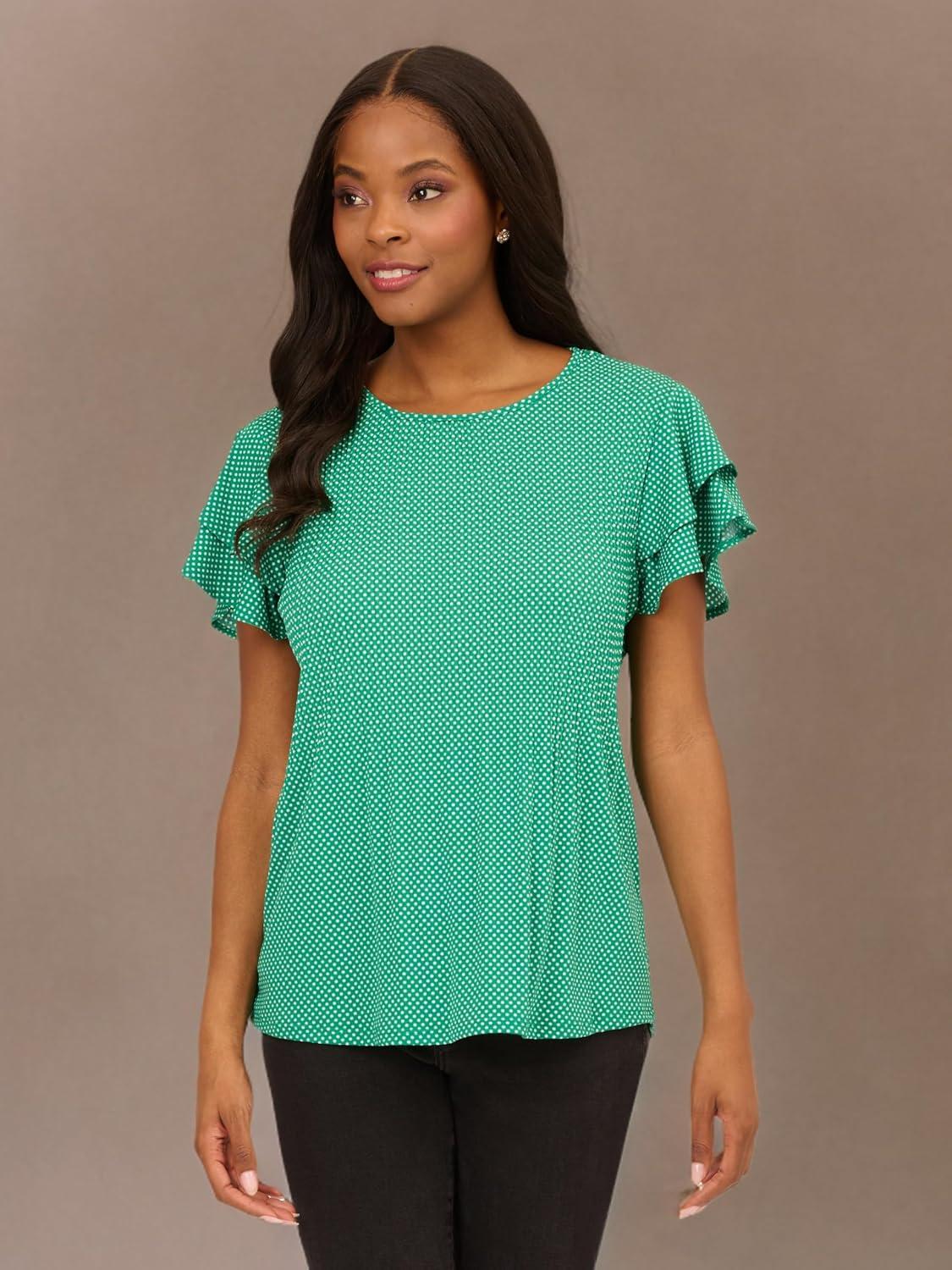 Adrianna Papell Womens Pleated Knit Double Sleeve Top(Dark Evergreen Brushed Dot)