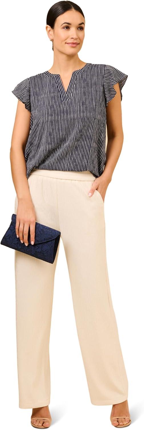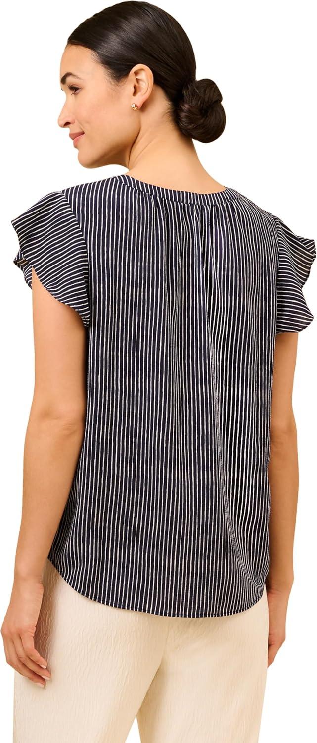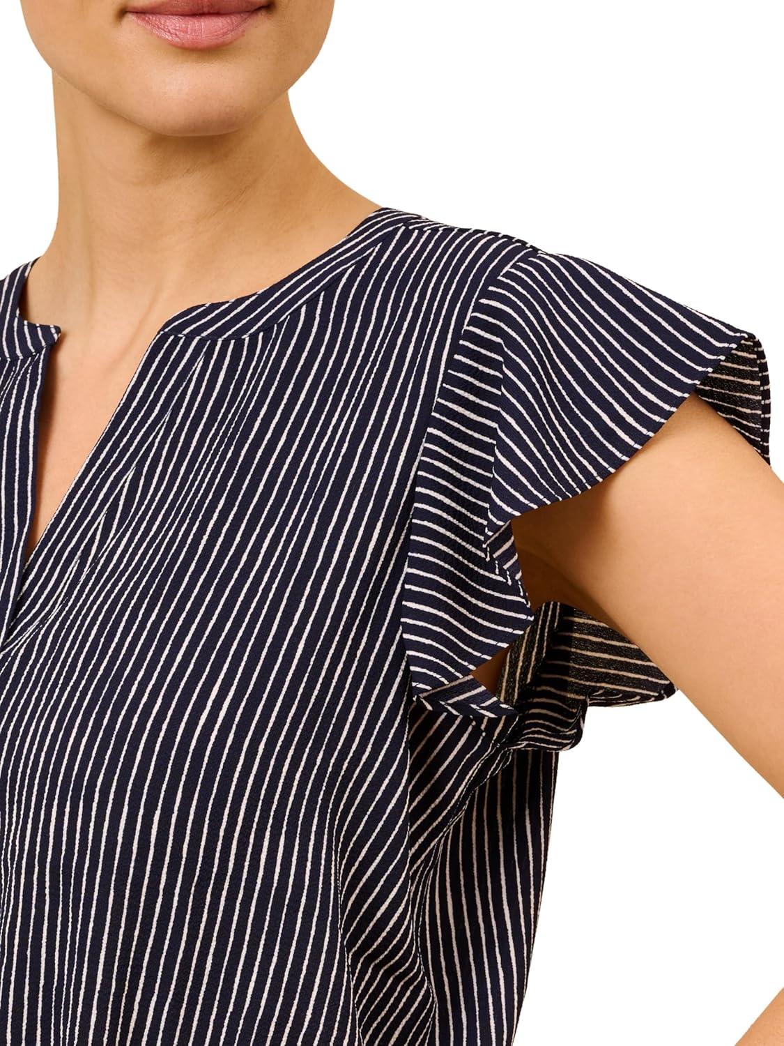 Adrianna Papell womens Solid Short Ruffle Sleeve Popover Blouse(Navy Ripple Stripe)