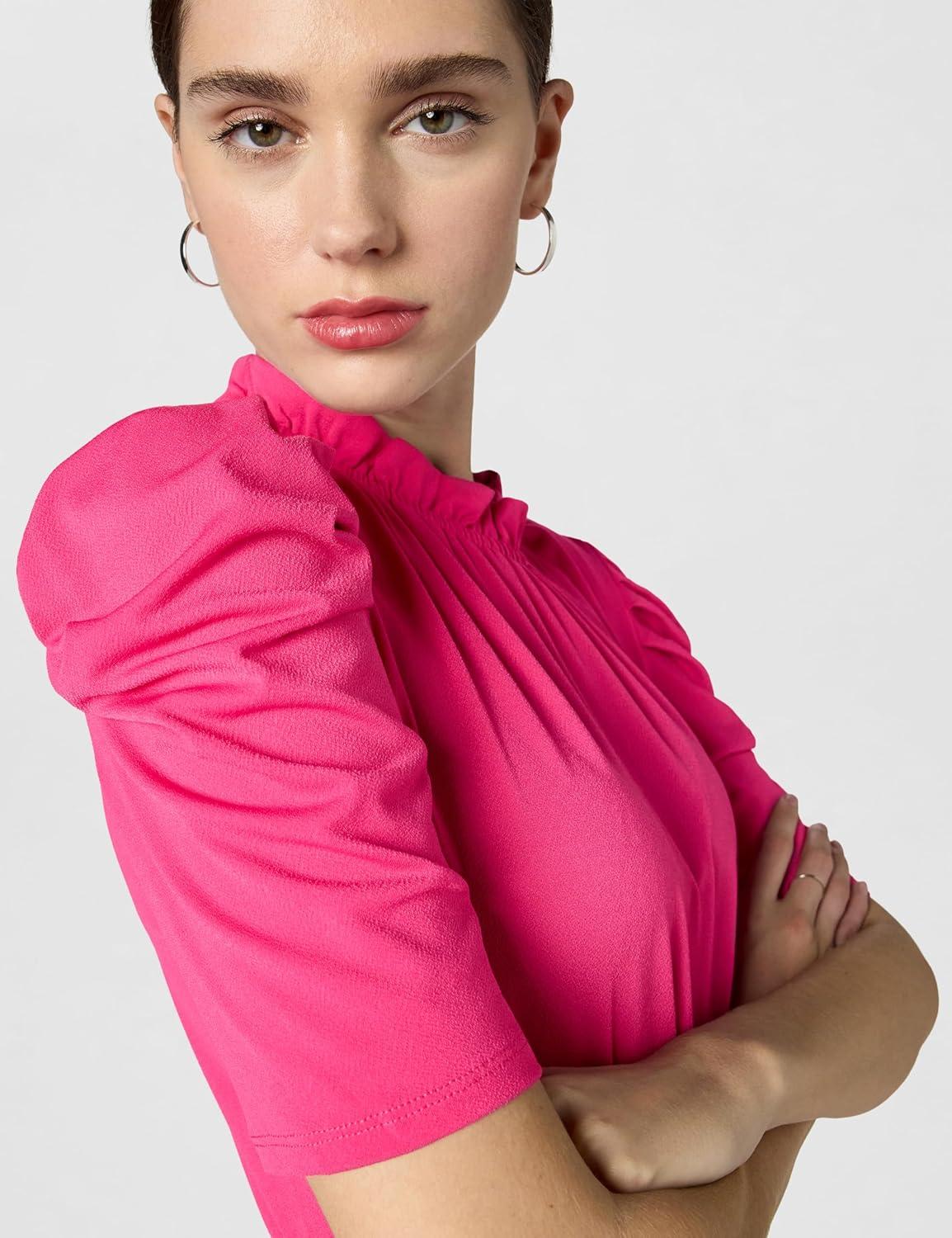 • Adrianna Papell Women’s Solid Knit Ruffle Neck Pleated Sleeve Midi Dress(Azalea Pink)