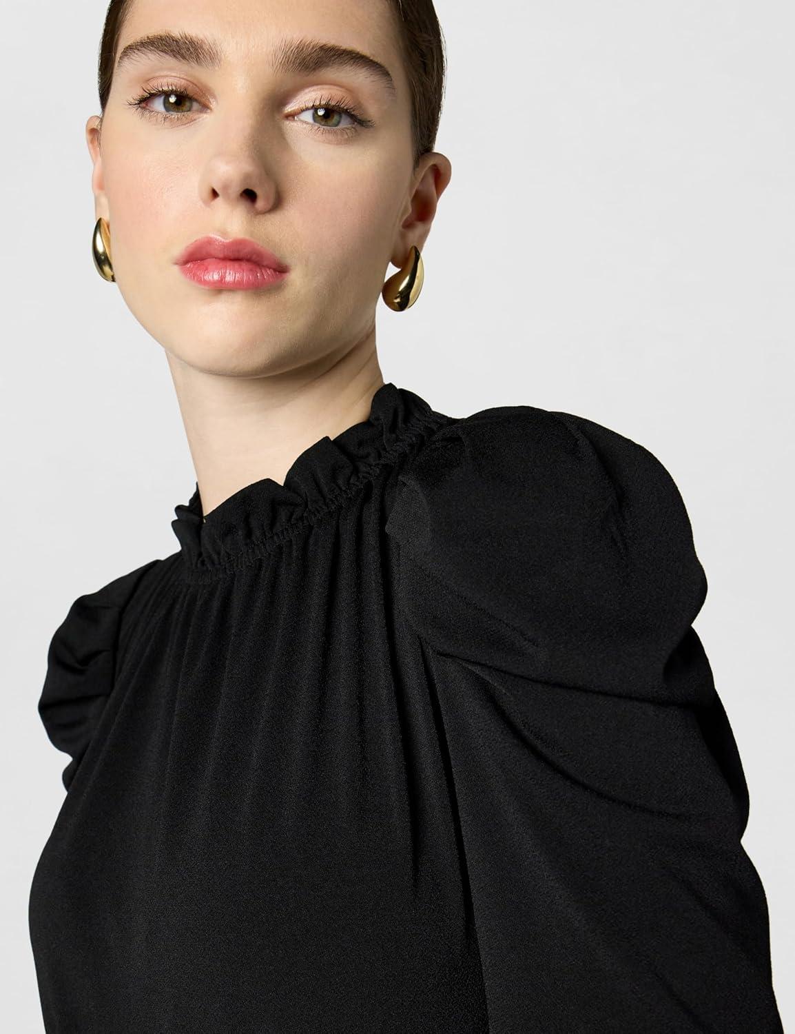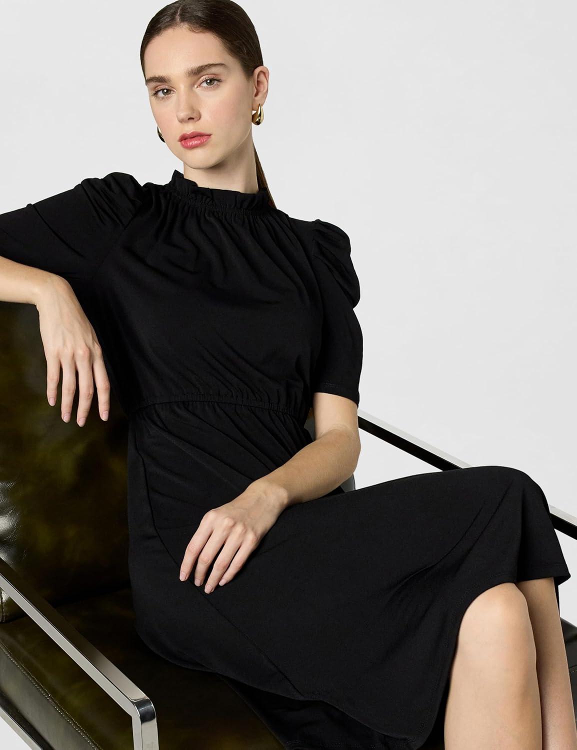 • Adrianna Papell Women’s Solid Knit Ruffle Neck Pleated Sleeve Midi Dress(Black)