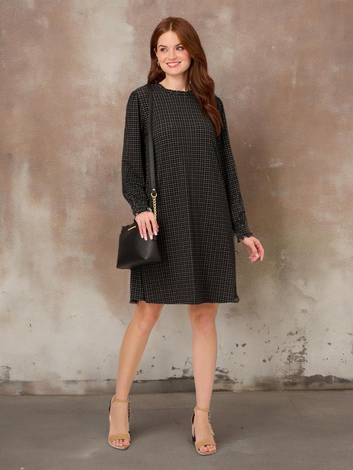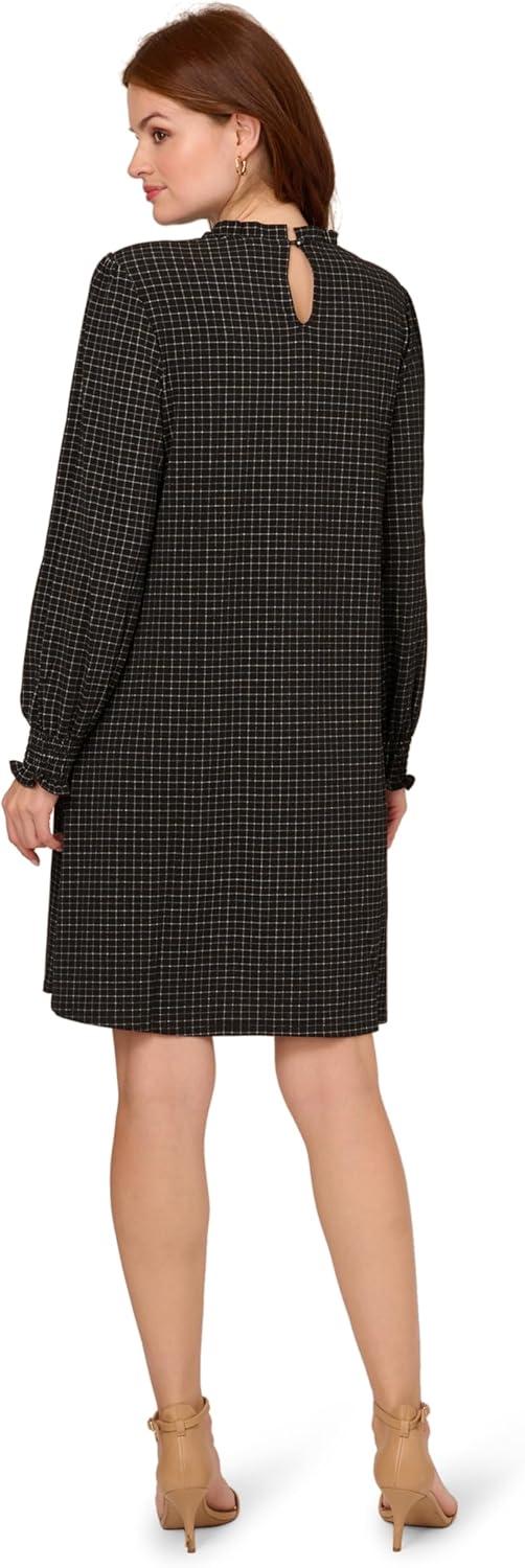 Adrianna Papell Womens Ruffle Neck Short Sleeve Dress(Black/Ivory Outline Dot)