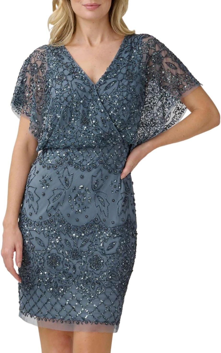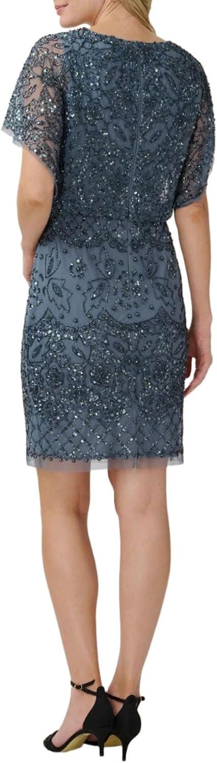 Adrianna Papell Women’s Beaded Mesh Blouson Dress(Dusty Blue)
