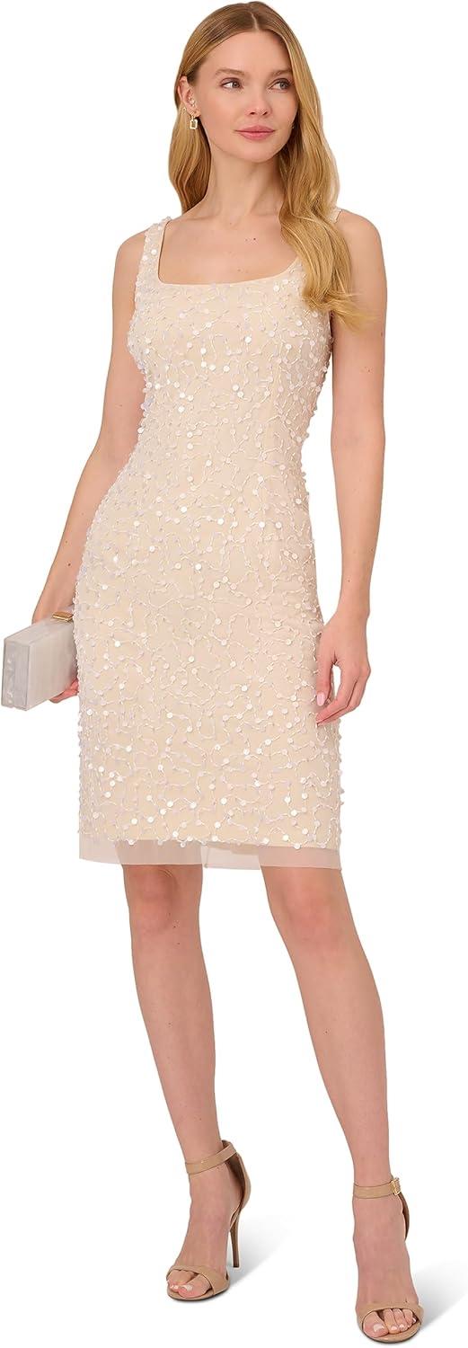 Adrianna Papell Women’s Beaded Square Neck Short Dress(Ivory/Pearl)