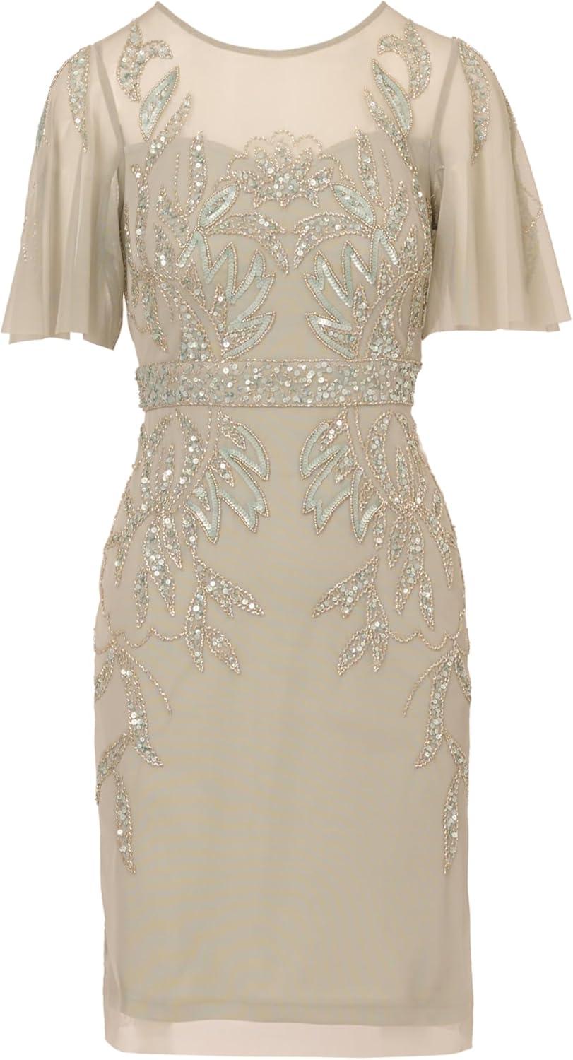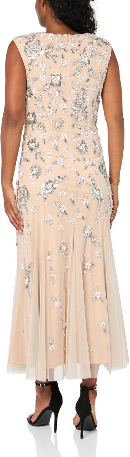Adrianna Papell Womens Beaded Mesh Ankle DressSpecial Occasion Dress(Silver/Nude)