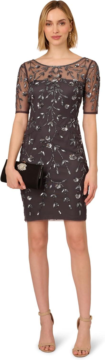 Adrianna Papell Women’s Beaded Floral Short Dress(Gunmetal)