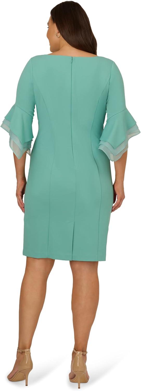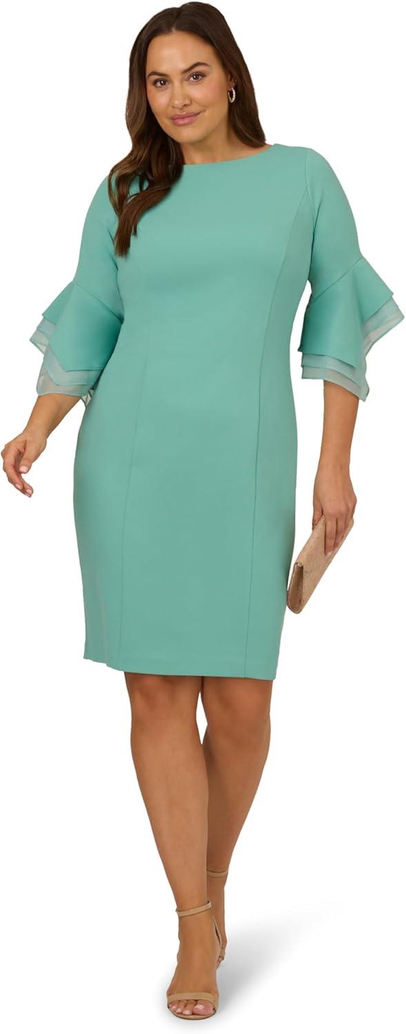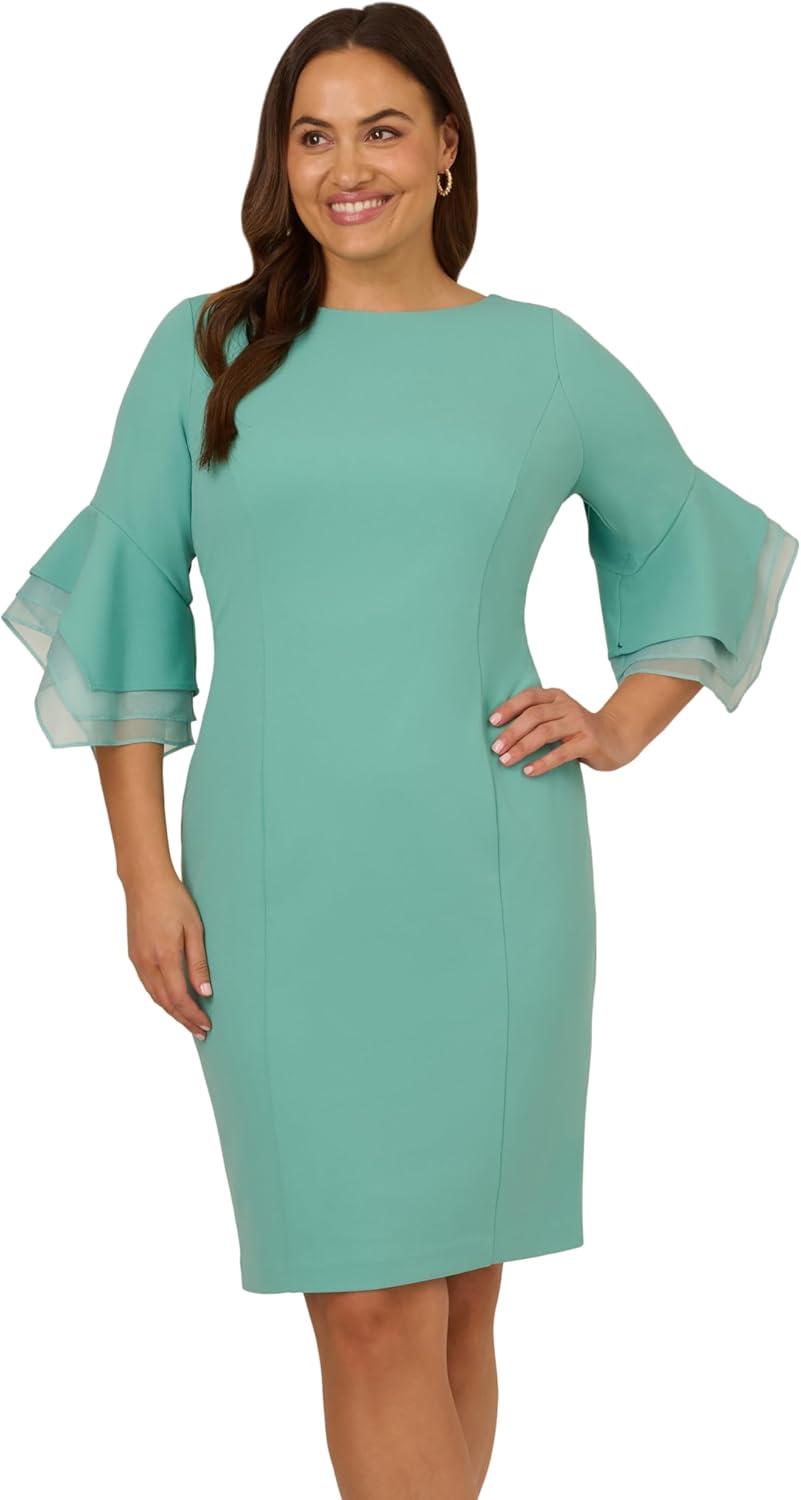 Dressed up meets versatile in this timeless sheath dress. This midi dress features a boat neckline, fitted silhouette through the body, and tiered three-quarter bell sleeves with organza accents. Crafted using knit crepe, this day dress has some stretch and no waist seam for a comfortable fit. A zipper back closure and a single pleat at the center back of the skirt hem completes the design.