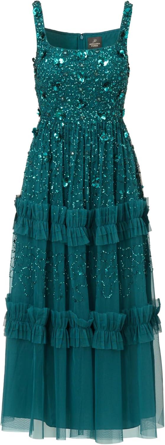 Whimsical yet refined, this midi cocktail dress is crafted from a sheer mesh overlay adorned with intricate beadwork and dimensional paillette flowers. The square neckline offers a clean, structured counterpoint to the romantic textures throughout. The fit and flare silhouette falls to a graceful mid calf length. Ruffled trim accents the cascading tiered skirt, creating soft movement with every step. A celebration of detail and craftsmanship, this stunning dress is ideal for weddings, formal garden parties, or evenings that call for a touch of magic.