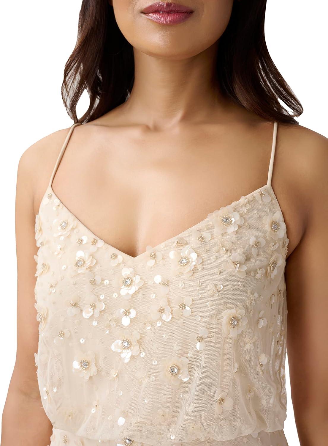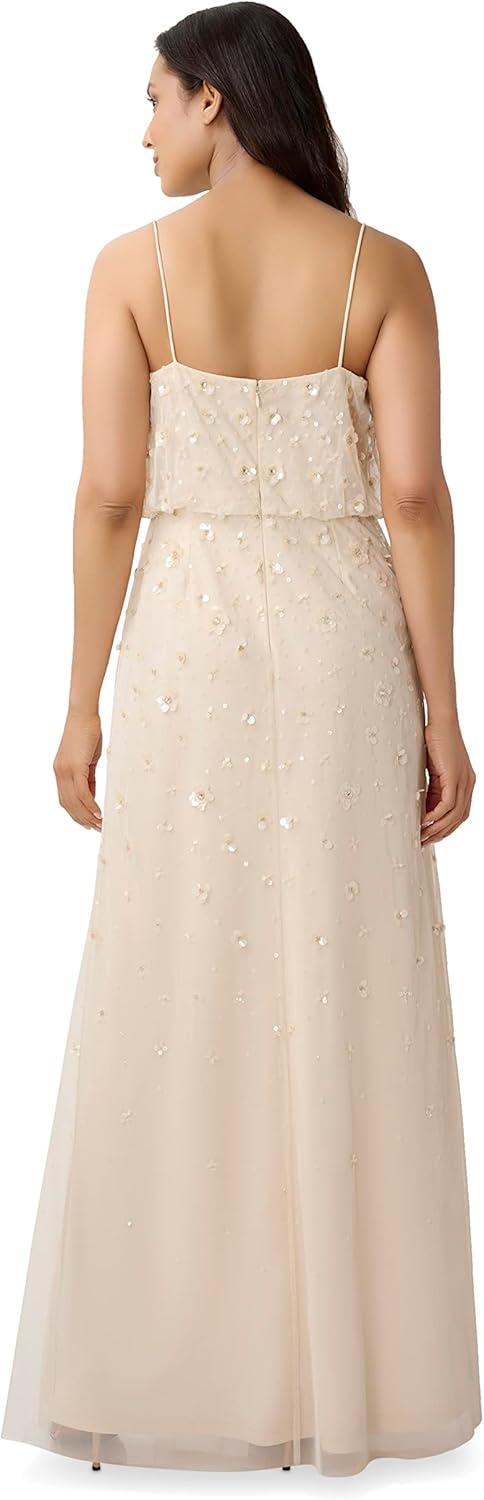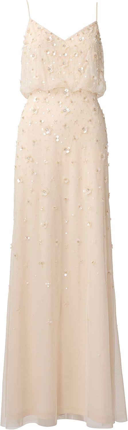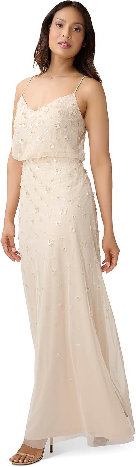 Sparkle and shine in our iconic blouson gown artfully embellished with handsewn 3D floral beading. The delicate spaghetti straps, v neckline and easy-fitting silhouette add to the feminine feel. Sleek back zip closure. A beautiful choice for bridesmaids, mother-of-the-bride/groom, wedding guests, charity balls and black-tie galas.