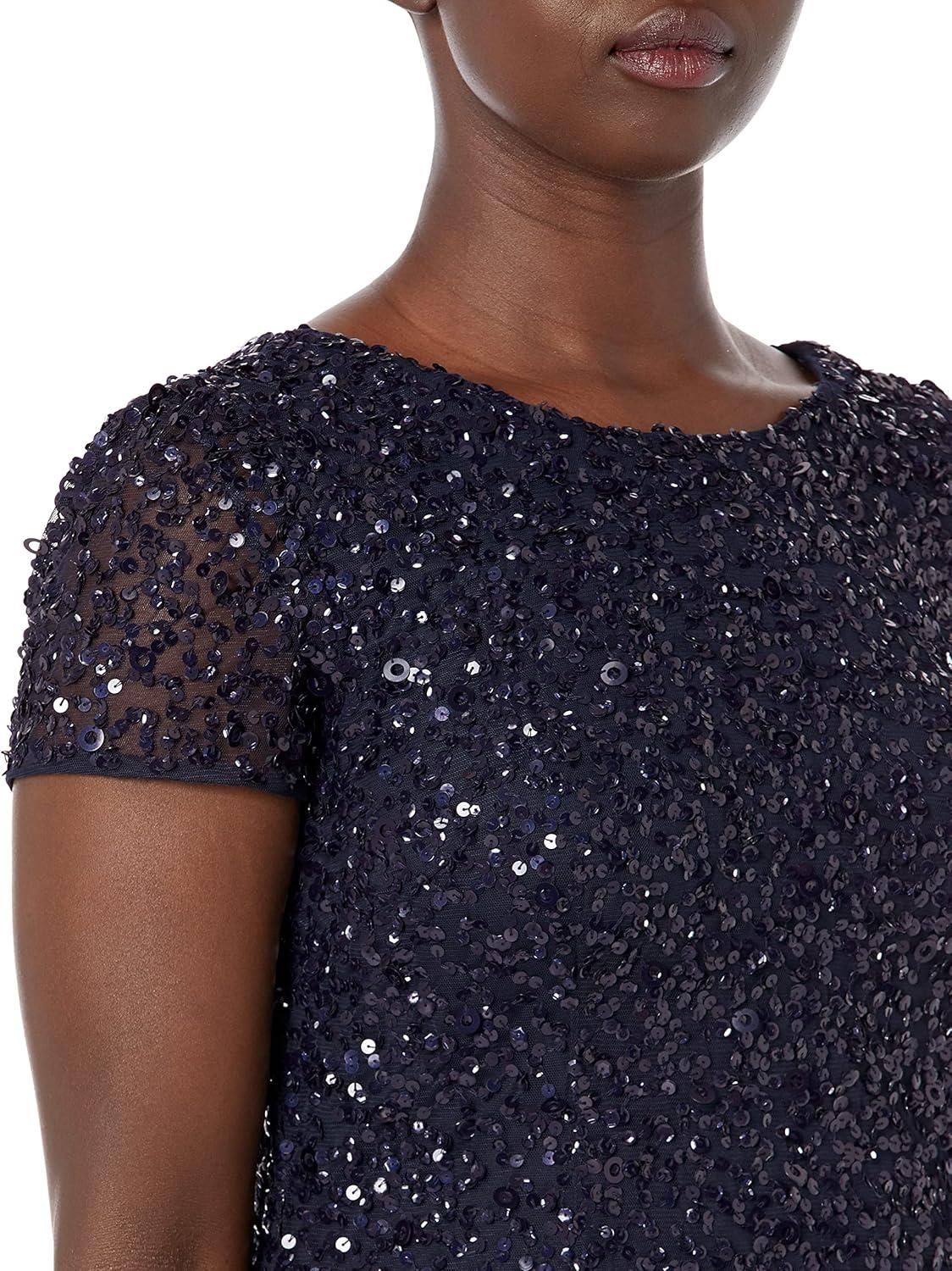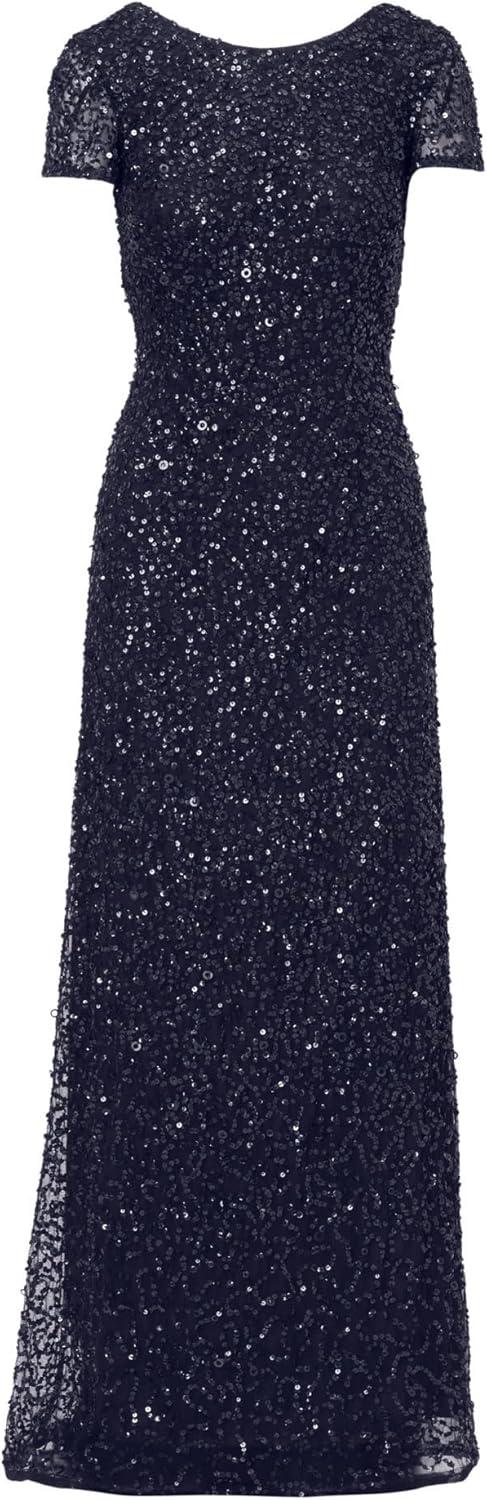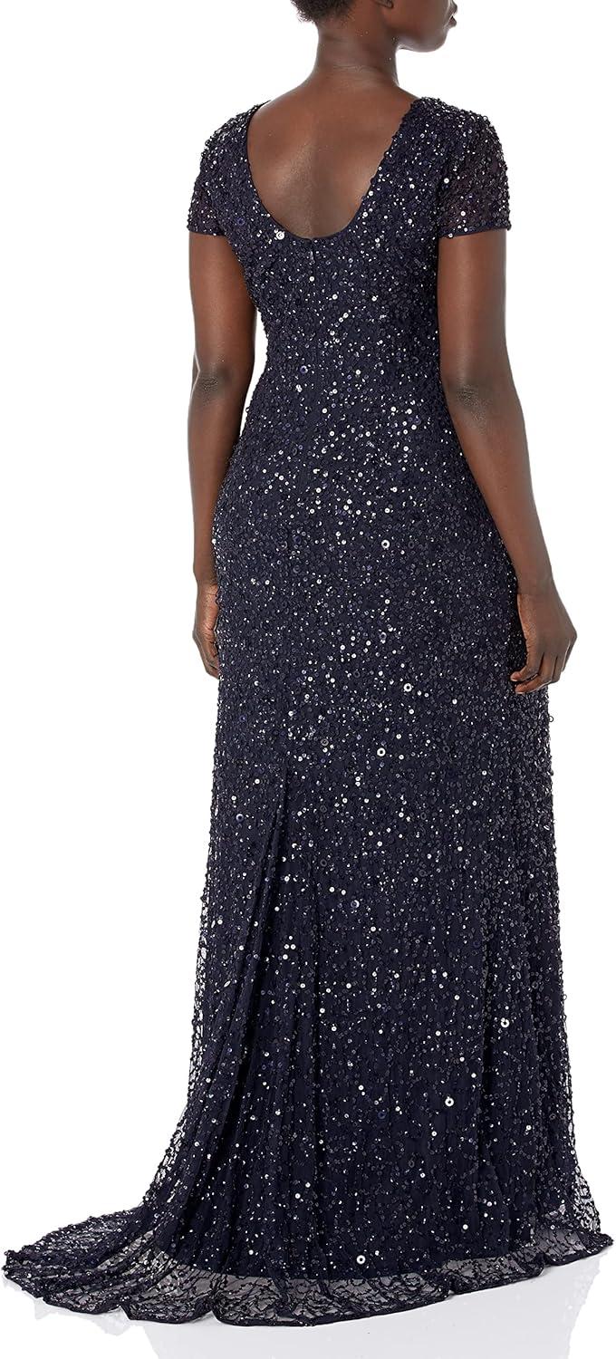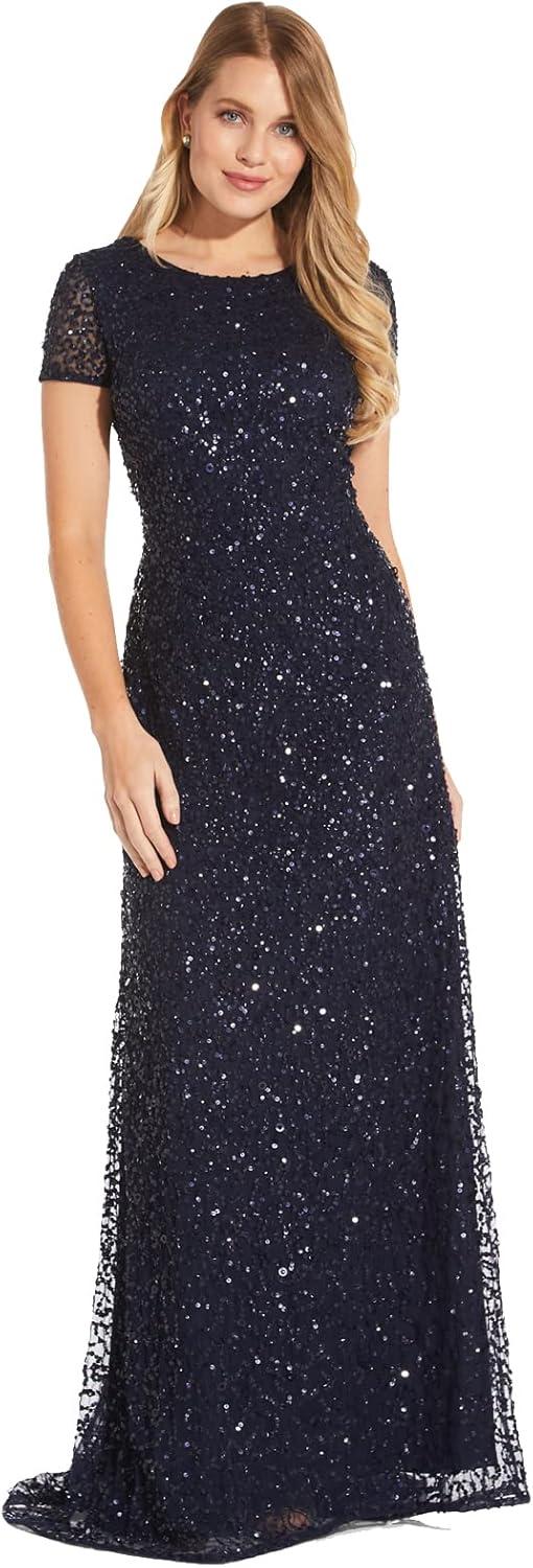 Rows upon rows of glittering sequins adorn this beautiful three-quarter sleeve gown, cast in an elegant silhouette.This Adrianna Papell design has been made from the finest and most luxurious fabrics. All bead work, embroidery and ornamentation has been done completely by hand. Slight irregularities or variations should not be regarded as defective or damaged, rather a testament to the garment’s unique beauty.