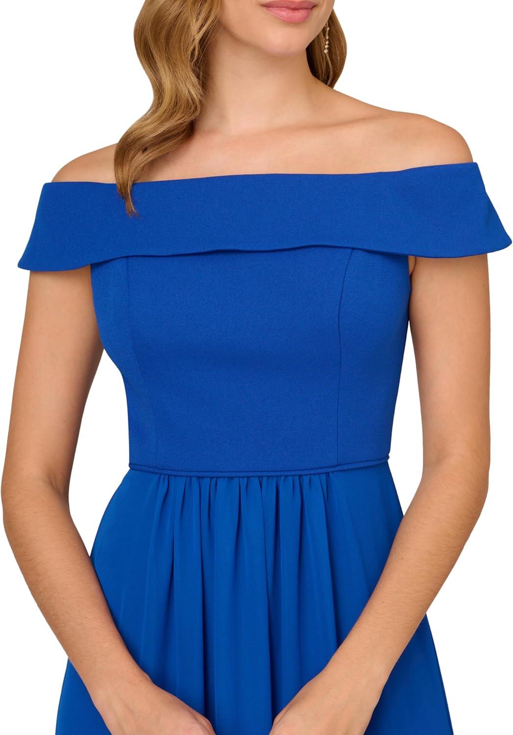 Poised and elegant, a timeless off-the-shoulder silhouette with a knit crepe bodice and soft, flowing skirt. For evenings out, weddings, and every occasion that calls for celebration. This dress pairs perfectly in your bridal party. As a bridesmaids dress this mixes perfectly with our beaded blouson styles or together with our chiffon bridesmaid collection.