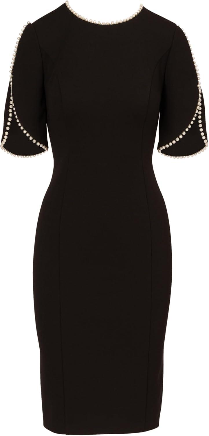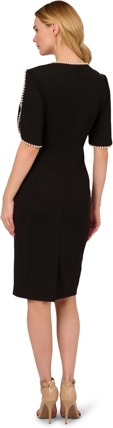 An elevated take on the little black dress, this cocktail style will shine at your next party. This dress features a boat neckline, fitted silhouette, and slit elbow-length sleeves trimmed in pearl beading. Crafted from knit crepe fabric with some stretch, this midi dress is as comfortable as itis versatile. A zipper center back closure and a slit at the back of the skirt completes this little black dress. From cocktail hour to semi formal attire events, this short sleeve dress is a iconic choice.