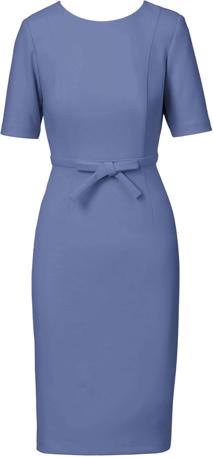 This retro-chic sheath dress uses crisp crepe fabric to create its clean elegant lines. Elbow sleeves, a crew neckline, and a knee-length hem keep the design demure, with princess seams and a back zipper ensuring a fitted silhouette. A cute bow at the center waistband adds the perfect finishing touch. If you want a moment of vintage glamor in your work and weekend wardrobe, this midi dress is the style for you.