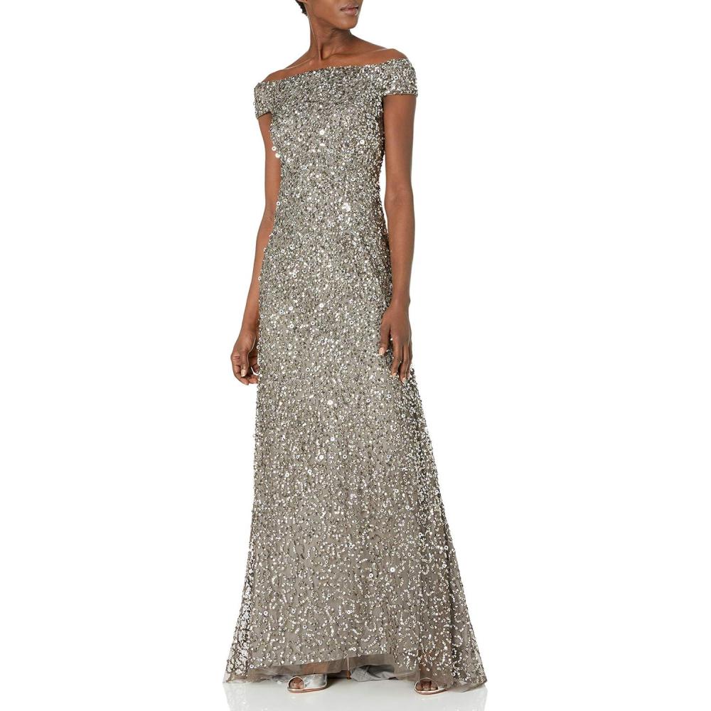 Adrianna Papell Women’s Off The Shoulder Crunchy Bead Gown(Lead)