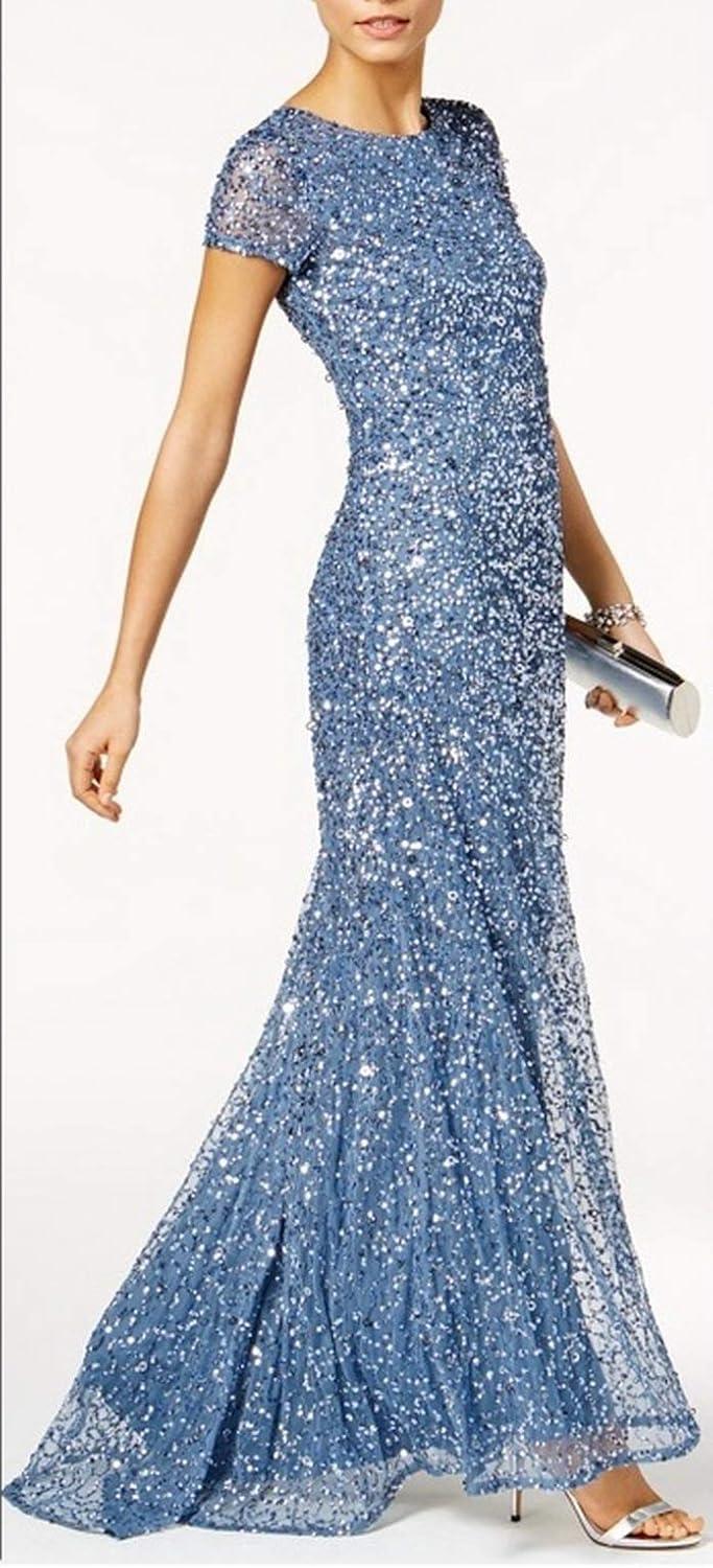 Fully beaded and embellished long gown with short sleeves, boat neck, and a blouson body