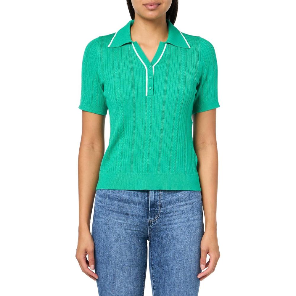 Preppy details make this top a timeless choice. This top features a v-neckline, polo collar, and short sleeves. Fitted through the body, this polo top is crafted from ribbed cable-knit fabric. Boasting tipped details at the collar and neckline, this top will be a favorite from days at theoffice to weekends spent with friends and family.