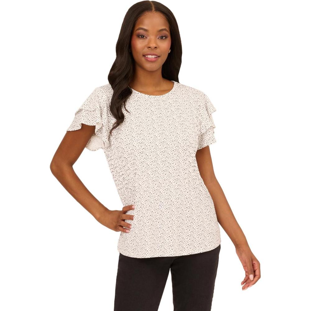 Adrianna Papell Womens Pleated Knit Double Sleeve Top(Ivory/Black Scattered Leaf)
