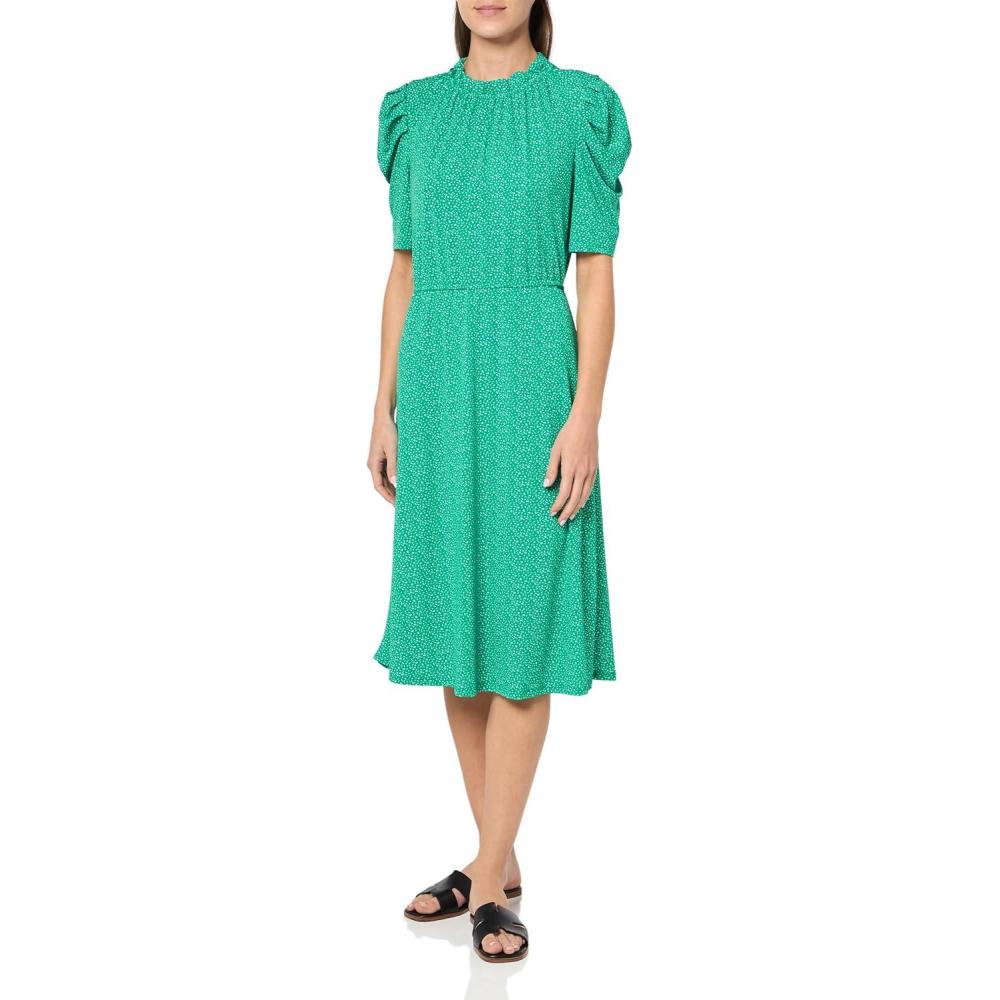 Adrianna Papell Womens Ruffle Neck Short Sleeve Dress(Emerald Scattered Leaf)