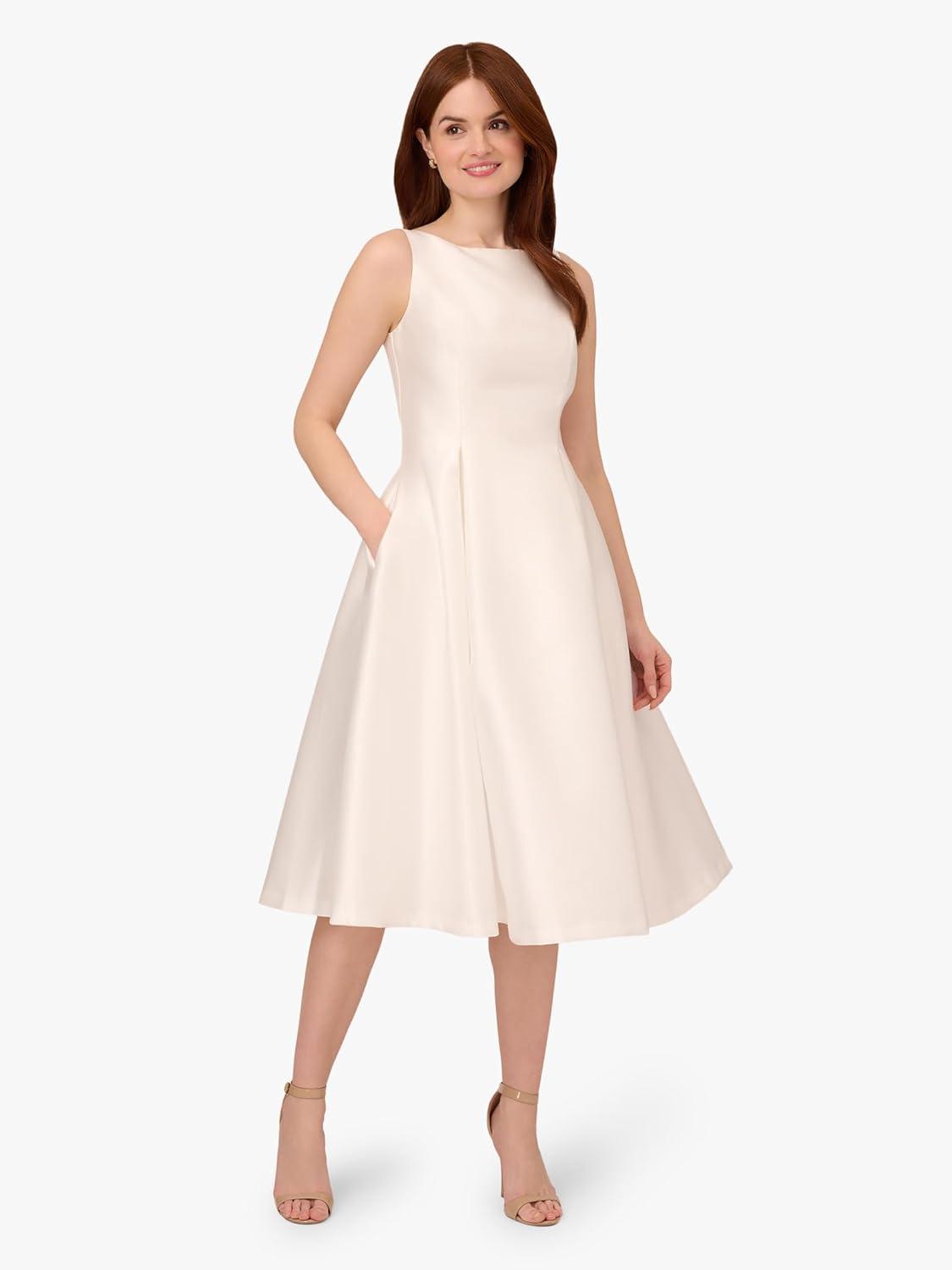It does not get any more timeless or sophisticated than this mikado dress. This cocktail dress features a sleeveless fitted bodice, boat neckline, and a pleated flare skirt with pockets. A zipper closure and a deep v-back add a final touch to this semi-formal dress. Crafted from shiningmikado fabric, this fit and flare dress is a feminine style. Dressed up with bold accessories or streamline with simple details, this sleeveless dress is a versatile look youll love for years to come.